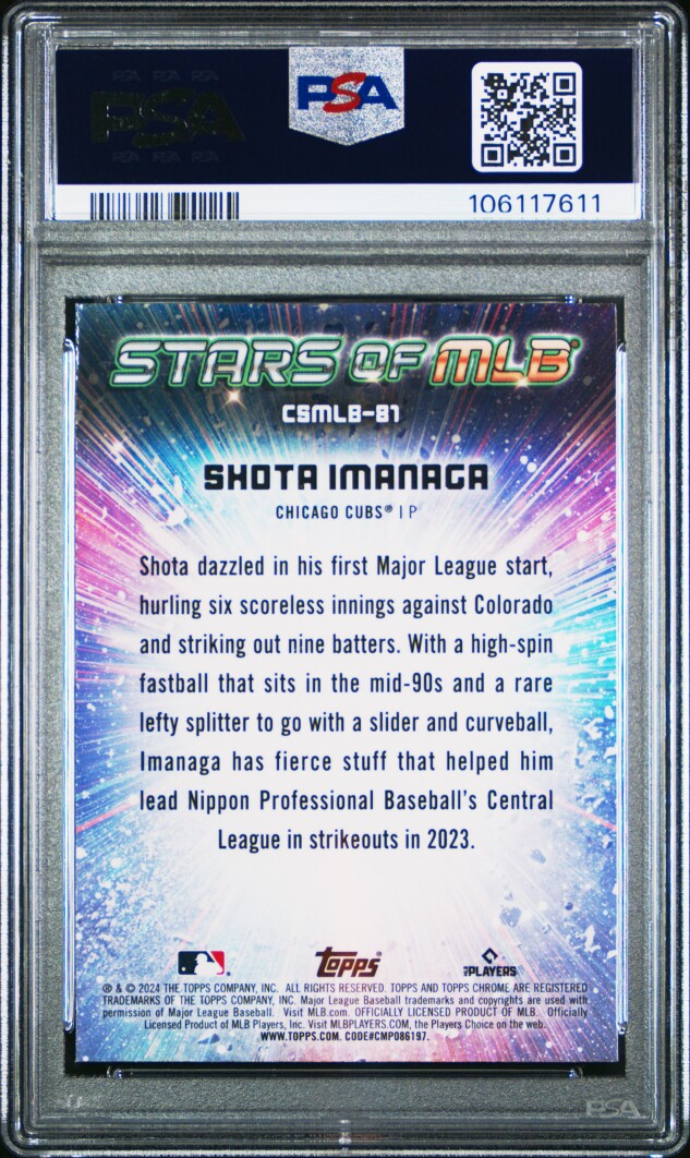 The product is a 2024 Topps Chrome baseball trading card featuring Shota Imanaga, a rookie player in Major League Baseball (MLB). The card has been professionally graded as a PSA 10 GEM, indicating it is in pristine condition. This collectible item is part of the Topps Chrome set and is designated with certification number 106117611. A valuable addition for fans and collectors alike, this card captures a promising player early in his career in the MLB.