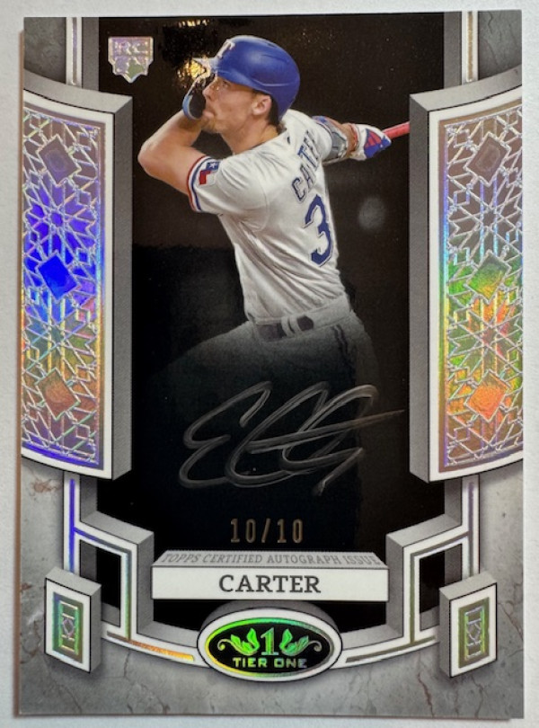 The product is a rare and highly sought after 2024 Topps Tier One Evan Carter Rookie Card featuring a Silver Ink Autograph. This limited edition card has a print run of only 10, making it a valuable collector's item for fans of the Texas Rangers and baseball enthusiasts alike. With its original card stock material and hard-signed autograph authentication by Topps, this card is sure to be a standout piece in any trading card collection. The card showcases Evan Carter, a promising player in the MLB World Series, making it a prized addition for fans of the sport.