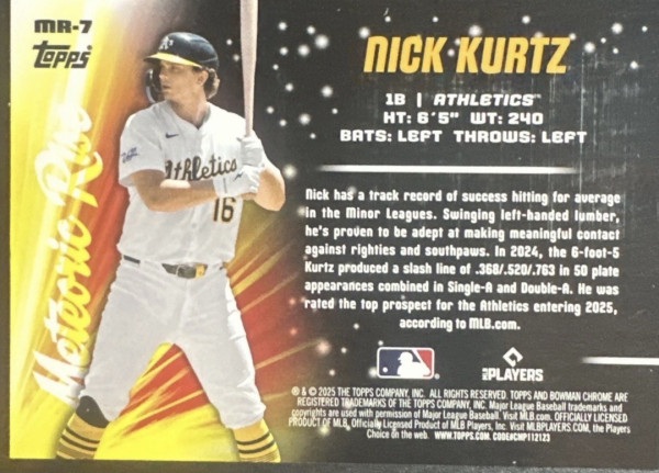 2025 Bowman Chrome Baseball Nick Kurtz Meteoric Rise RC #MR-7 Athletics