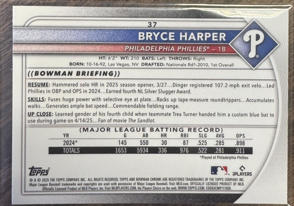 2025 Bowman Chrome Bryce Harper #37 Mojo Refractor
