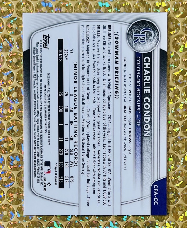 2025 Bowman Chrome Charlie Condon 1st Bowman On Card Auto