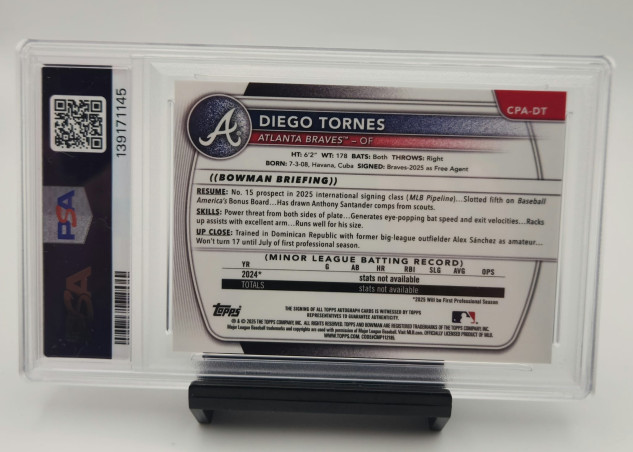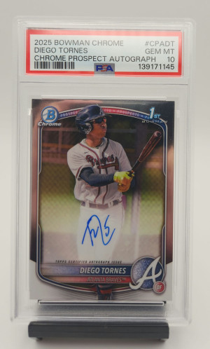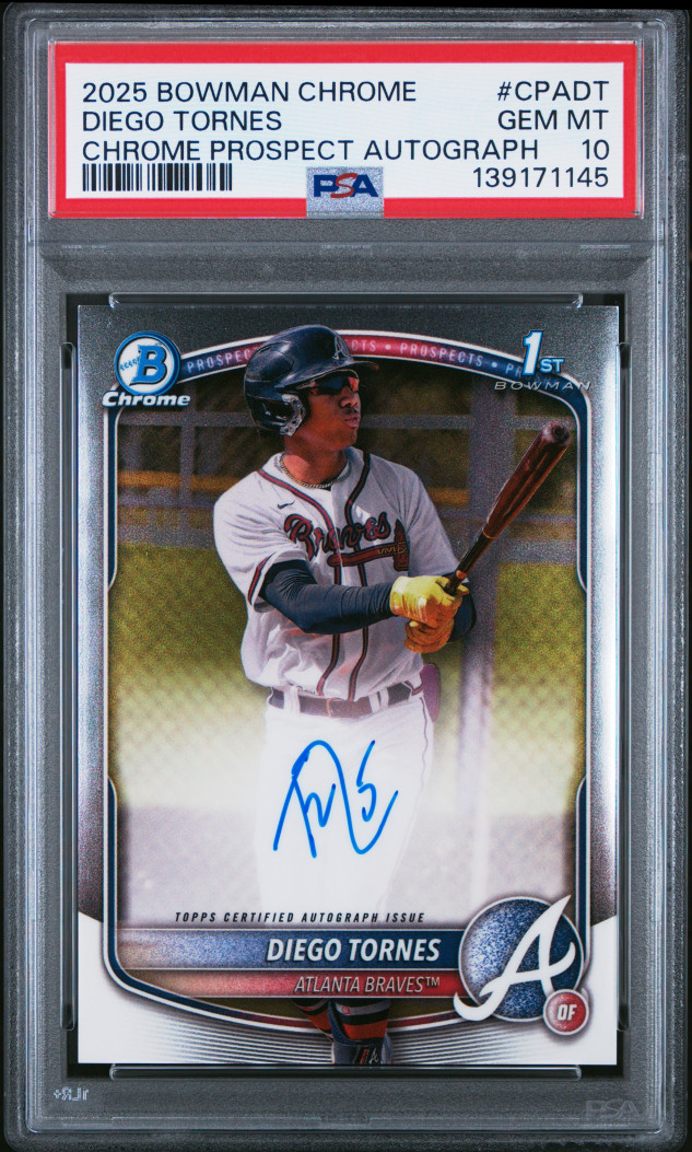 You are looking at a 2025 Bowman Chrome Chrome Prospect Autograph of Diego Tornes, card number #CPA-DT, graded PSA 10 GEM MINT the absolute highest grade possible. PSA cert #139171145. This is his 1st Bowman card, making it the most important and collectible card of his career.
