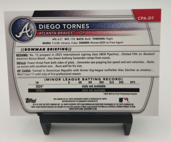 This is the FIRST BOWMAN AUTOGRAPH of one of the most exciting international prospects in baseball today. Diego Tornes is ranked #15 in the 2025 MLB Pipeline International Signing Class and sits 5th on Baseball America's Bonus Board a name every serious collector needs to know right now.
