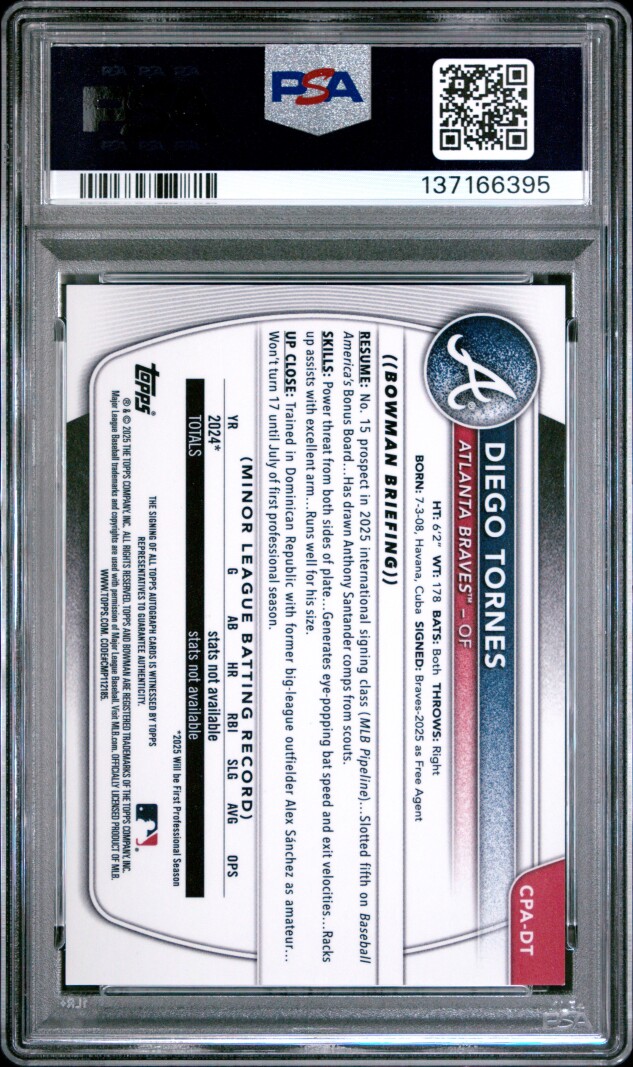 2025 Bowman Chrome Diego Tornes Speckle Refractor Auto /299 PSA 10 Braves
