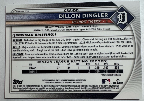 2025 Bowman Chrome Dillon Dingler Rookie RC Auto Refractor /499 -TIGERS 🔥 💰 🔥