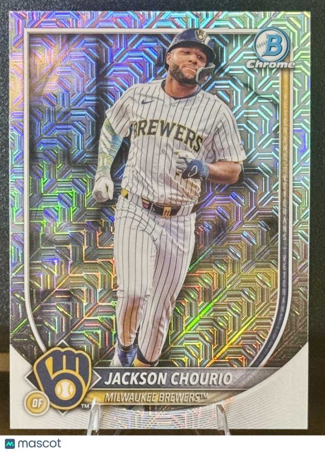 Don't miss out on this stunning 2025 Bowman Chrome Mojo Refractor featuring top Milwaukee Brewers prospect Jackson Chourio! This highly sought-after card is a must-have for MLB collectors and Brewers fans, showcasing vibrant refractor shine and crisp detail. Secure this standout card for your collection before it's gone—these Mojo Refractors are always in high demand!