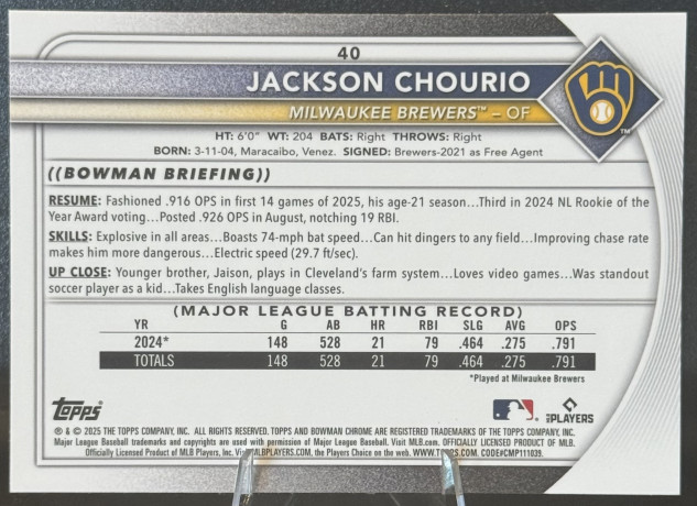 Produced by Topps and part of the 2025 Bowman Chrome set, this near mint or better card is an excellent investment for any baseball card enthusiast. Whether you're building your Brewers collection or chasing the hottest prospects, Jackson Chourio's Mojo Refractor is sure to impress. Add it to your lineup today!