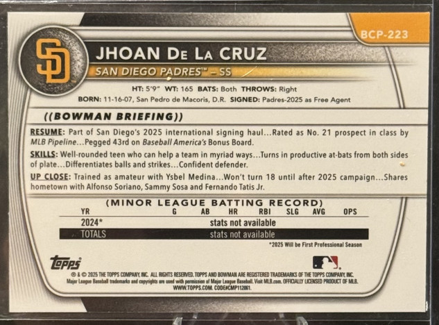 2025 Bowman Chrome Jhoan De La Cruz #BCP-223 Laser Refractor