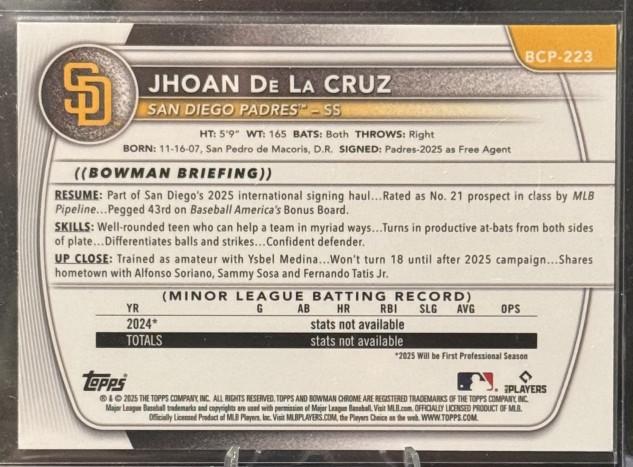 2025 Bowman Chrome Jhoan De La Cruz #BCP-223 Mojo Refractor