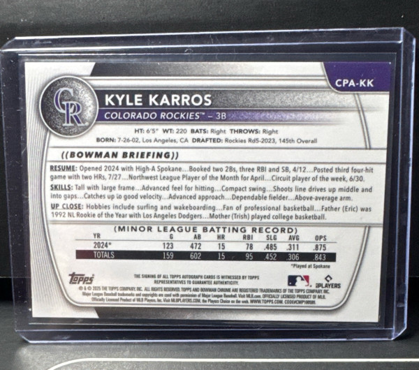 2025 Bowman Chrome Kyle Karros 1st Bowman Auto #CPA-KK Rockies