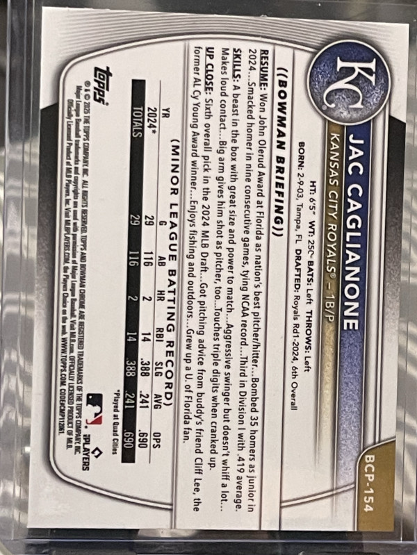 2025 Bowman Chrome - Prospects Jac Caglianone, Jac Caglianone #BCP-154 (RC)