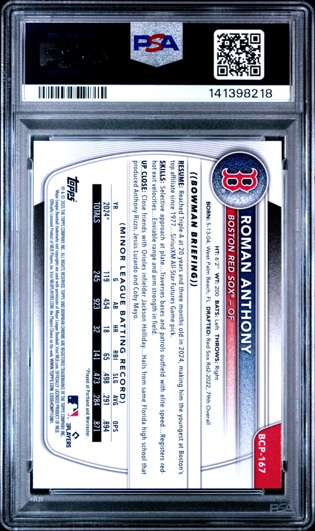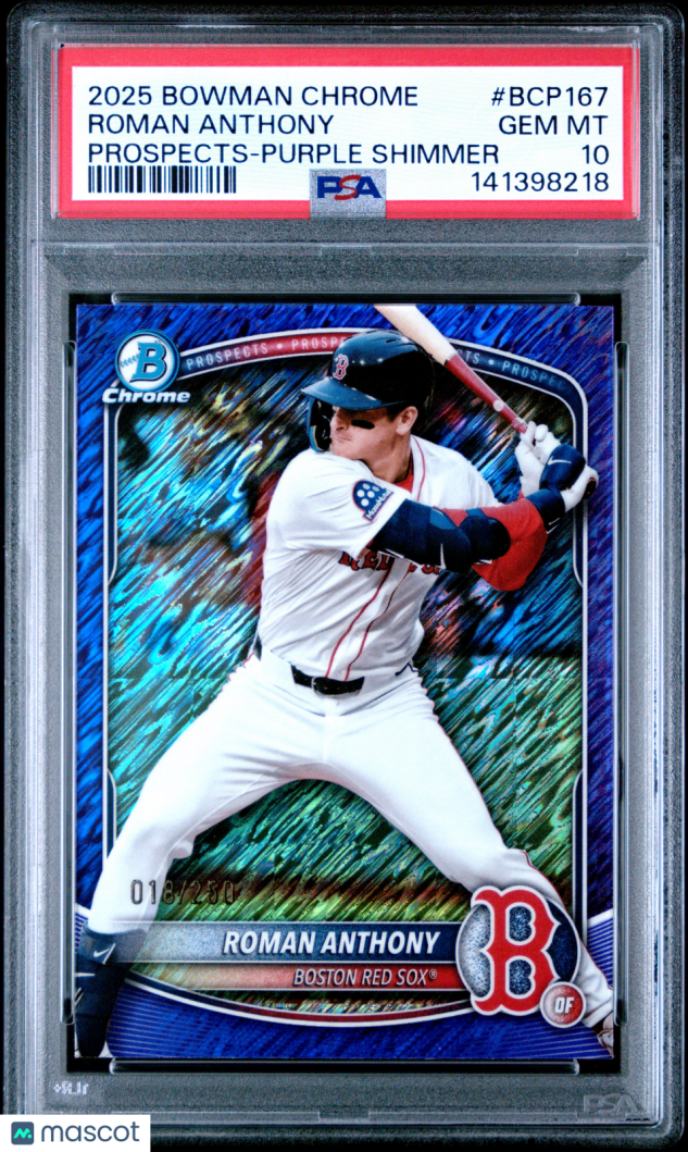 You are purchasing a 2025 Bowman Chrome Prospects Roman Anthony #BCP167 Purple Shimmer 018/250 PSA 10. You will receive the exact item in the photographs. Thank you for looking.