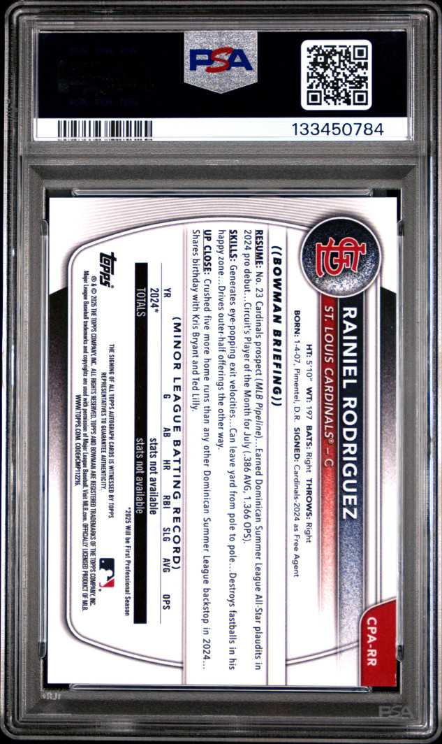 ๐ฅ 2025 Bowman Chrome Prospect Auto Rainiel Rodriguez #CPA-RR PSA 10 GEM MINT | 1st Bowman | St. Louis Cardinals