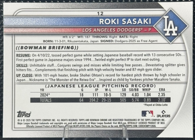 2025 Bowman Chrome Roki Sasaki #12