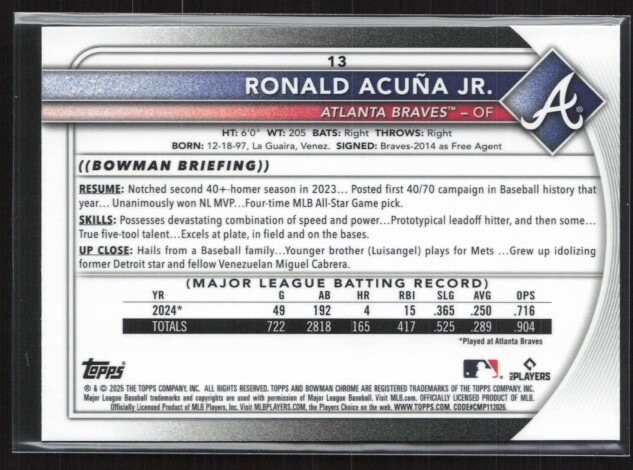 You are purchasing a 2025 Bowman Chrome Ronald Acuña Jr. #13 40/70. You will receive the exact item in the photographs. Thank you for looking.