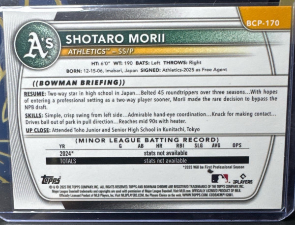 2025 Bowman Chrome Shotaro Morii 1st Prospect Chrome Athletics #BCP-170