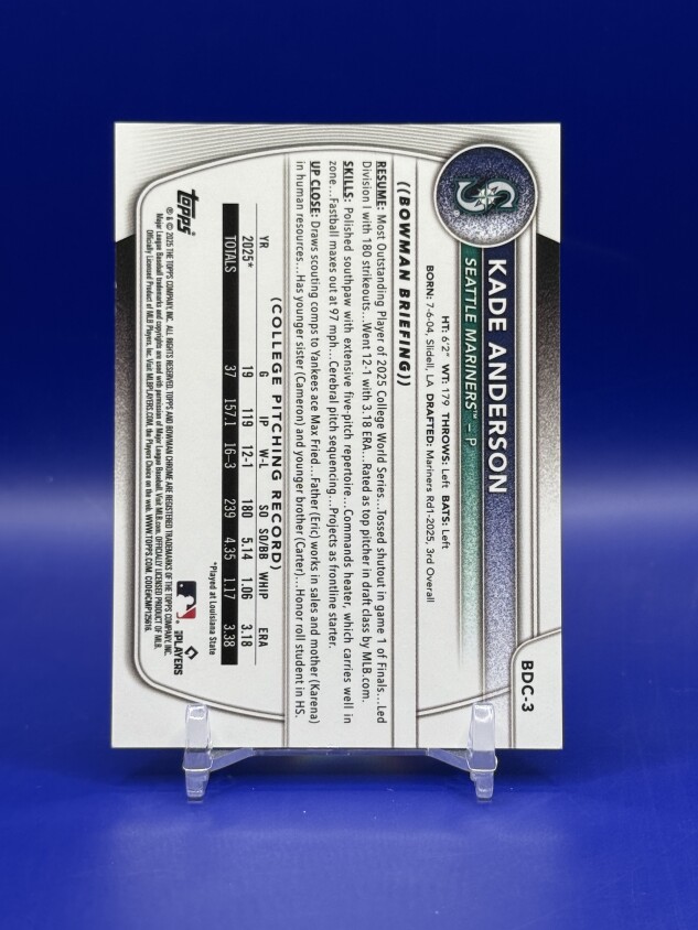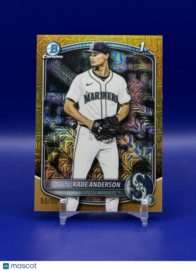 Don’t miss your chance to own this stunning 2025 Bowman Draft Chrome Yellow Mojo Refractor featuring Seattle Mariners prospect Kade Anderson! This card is serial numbered 50/50, making it the final one produced in this exclusive parallel—an absolute must-have for serious MLB collectors and Mariners fans. The vibrant Yellow Mojo finish and crisp Topps quality make this a standout addition to any collection.