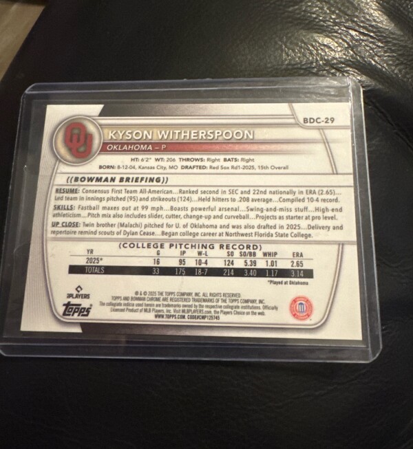 2025 Bowman Draft Kyson Witherspoon #BDC-29 College Variation Black #/10 Red Sox!