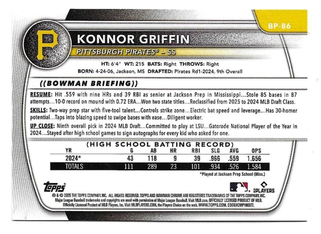 2025 BOWMAN PROSPECTS #BP-86 KONNOR GRIFFIN (RC)