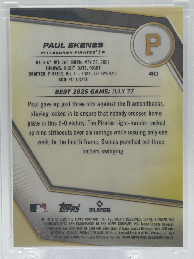 2025 Bowman's Best #40 Paul Skenes Gold Refractors # 1/50 First on Print