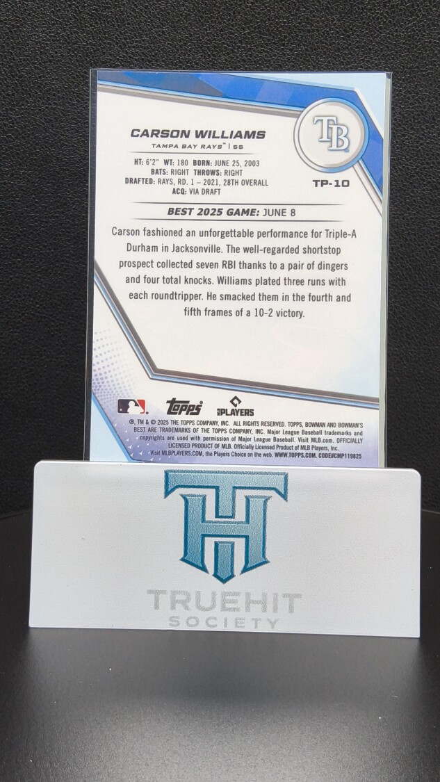 You are purchasing a 2025 Bowman's Best Carson Williams #TP-10. You will receive the exact item in the photographs. Thank you for looking.