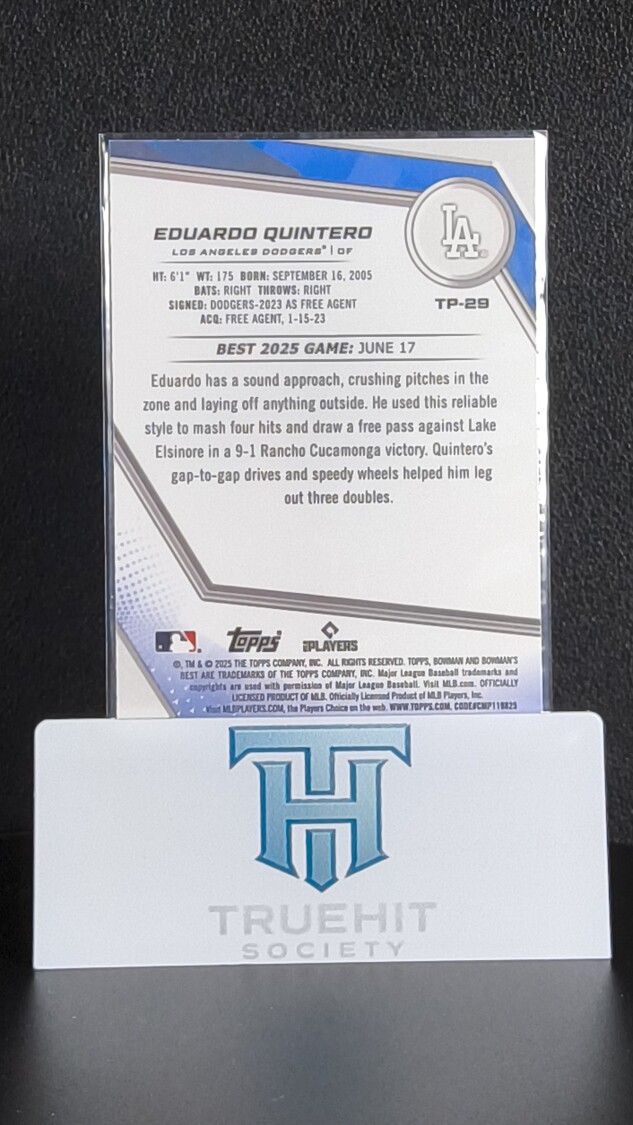 You are purchasing a 2025 Bowman's Best Eduardo Quintero #TP-29. You will receive the exact item in the photographs. Thank you for looking.