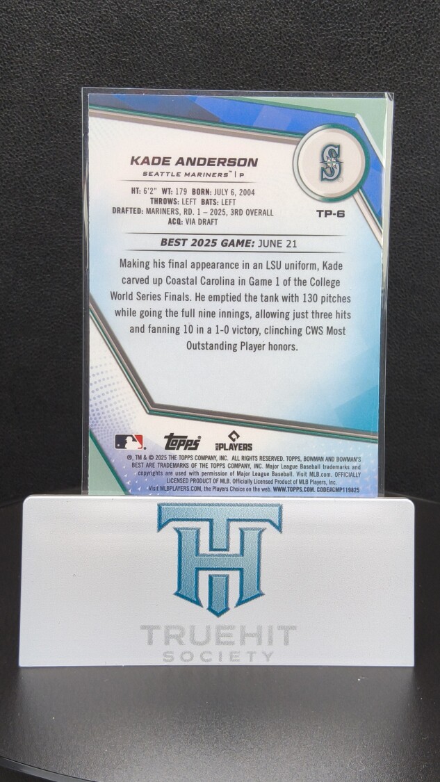 You are purchasing a 2025 Bowman's Best Kade Anderson #TP-6. You will receive the exact item in the photographs. Thank you for looking.