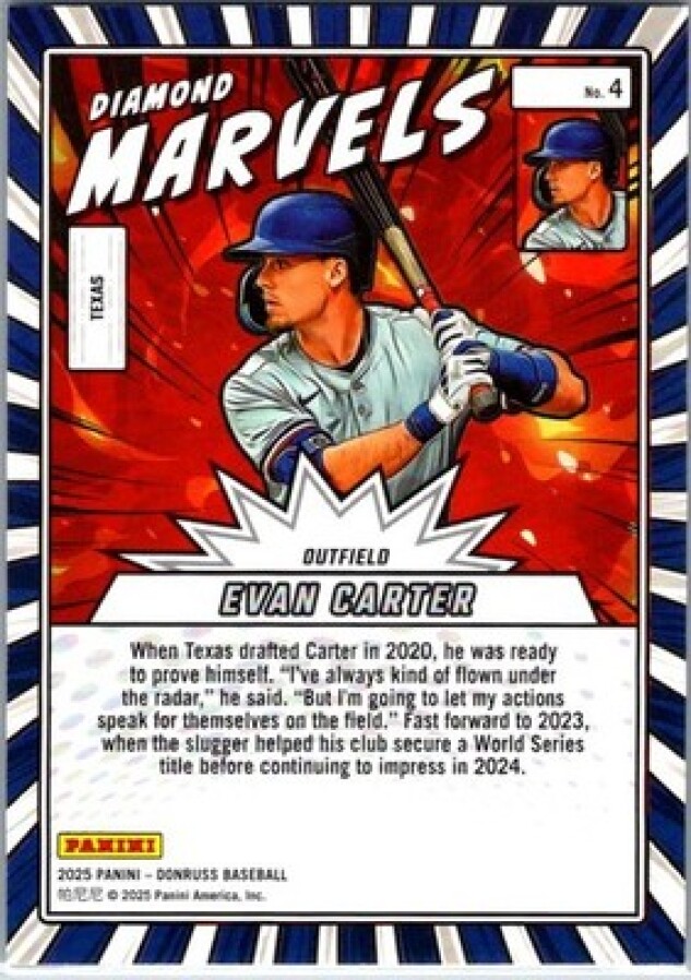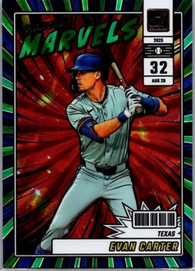 This is a nice example of a 2025 Donruss #4 Evan Carter Diamond Marvels Green Laser