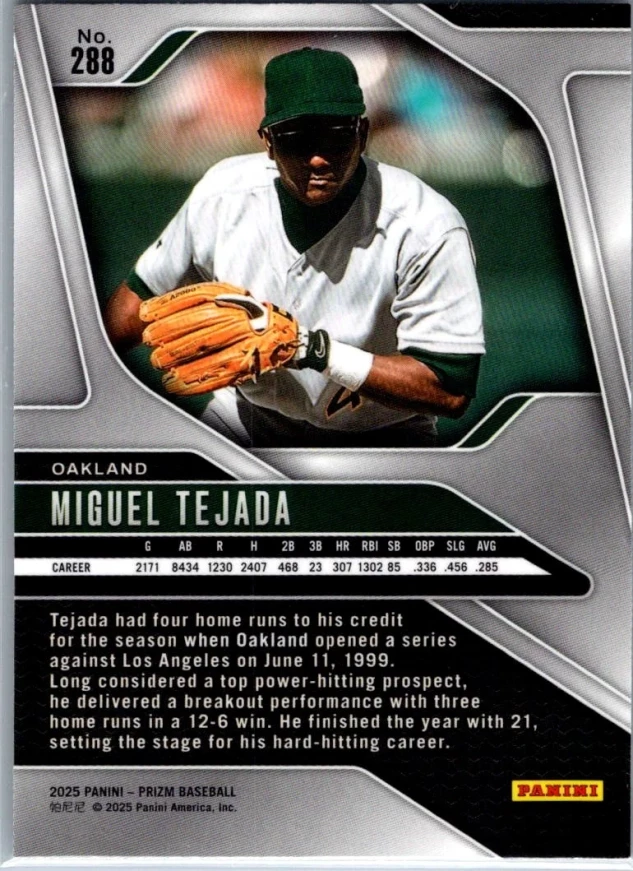 This is a nice example of a 2025 Panini Prizm #288 Miguel Tejada