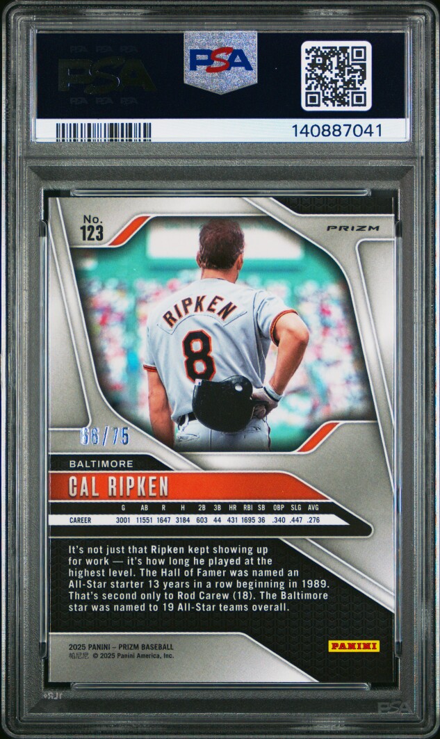You are purchasing a 2025 Panini Prizm Cal Ripken #123 Blue Pulsar 66/75 PSA 10. You will receive the exact item in the photographs. Thank you for looking.