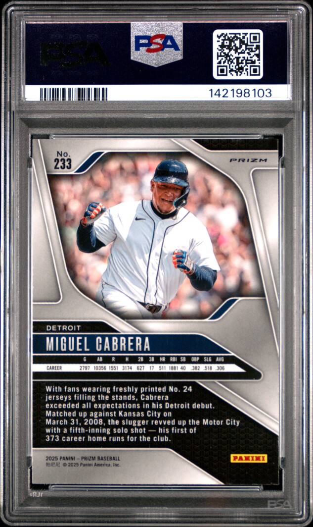 You are purchasing a 2025 Panini Prizm Miguel Cabrera #233 Glitter PSA 10. You will receive the exact item in the photographs. Thank you for looking.