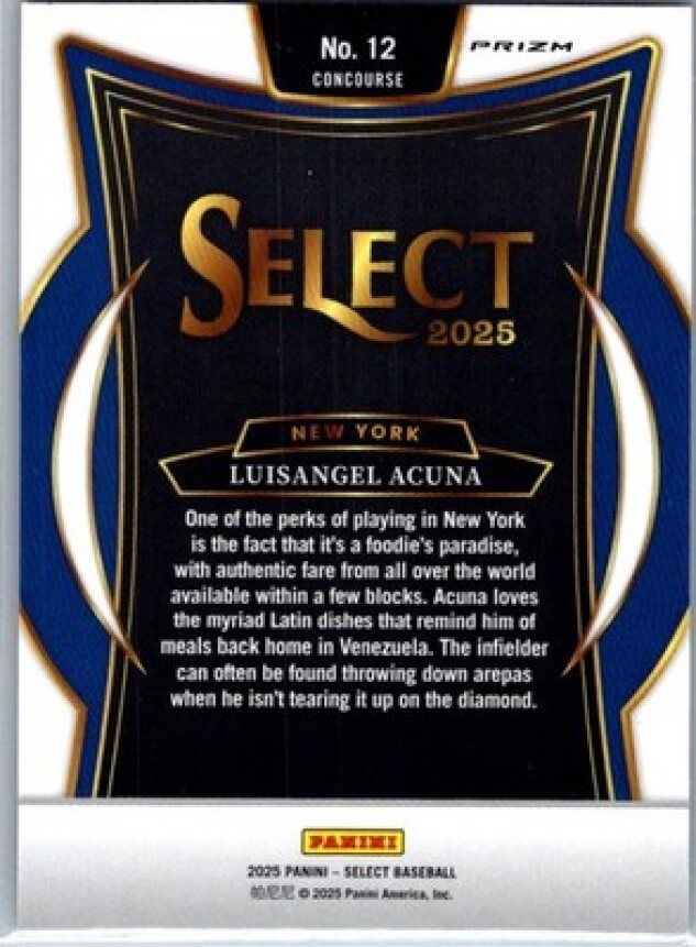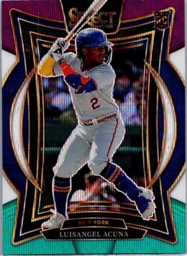 This is a nice example of a 2025 Panini Select #12 Luisangel Acuna Tri-Color Prizms