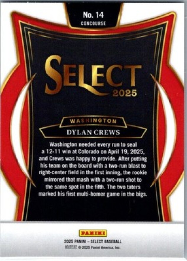 This is a nice example of a 2025 Panini Select #14 Dylan Crews