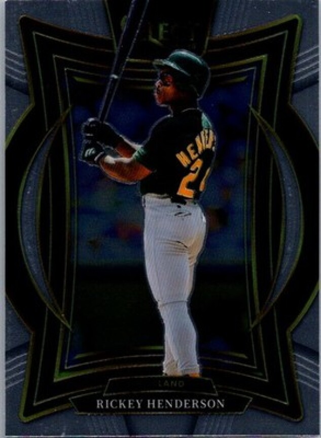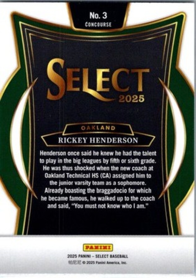 This is a nice example of a 2025 Panini Select #3 Rickey Henderson