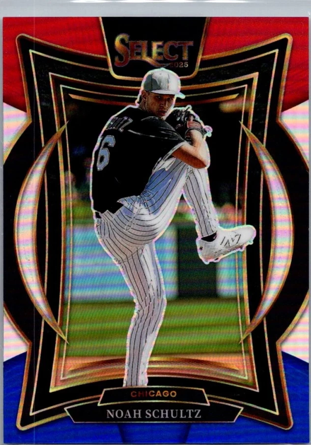 This is a nice example of a 2025 Panini Select #35 Noah Schultz Red and Blue Prizms