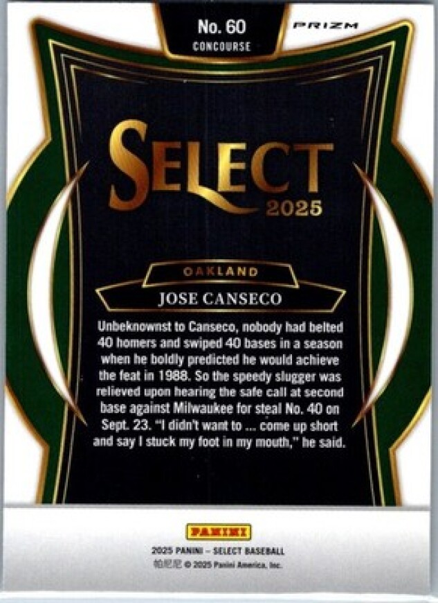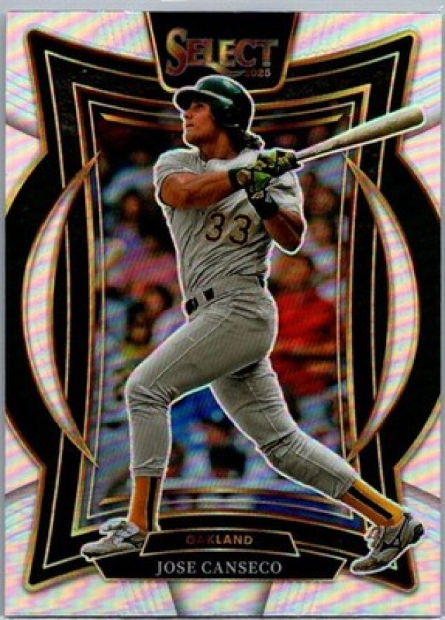 This is a nice example of a 2025 Panini Select #60 Jose Canseco Silver Prizms