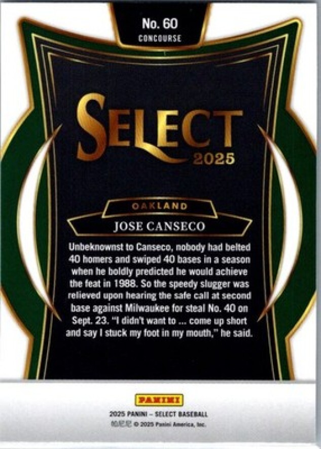 This is a nice example of a 2025 Panini Select #60 Jose Canseco