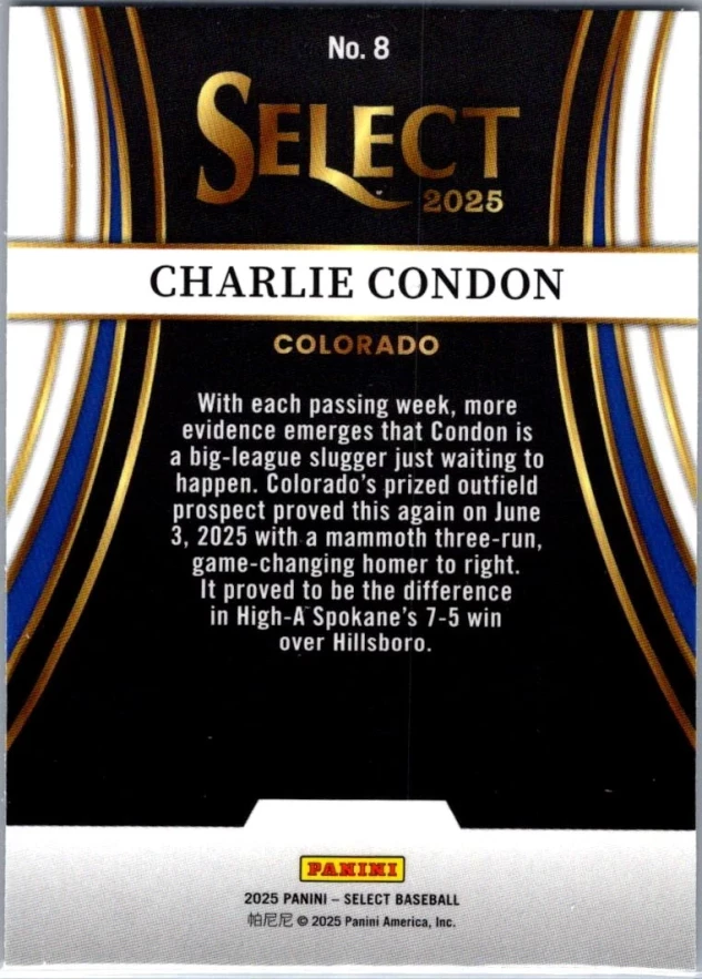 This is a nice example of a 2025 Panini Select #8 Charlie Condon Turbo Charged