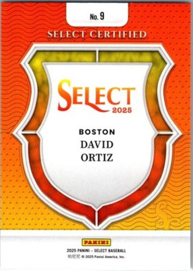 This is a nice example of a 2025 Panini Select #9 David Ortiz Select Certified
