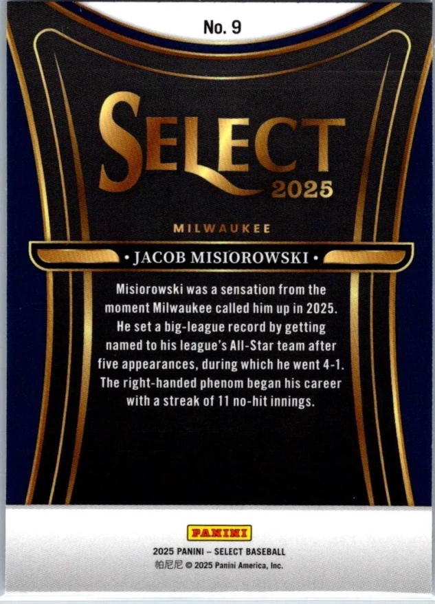This is a nice example of a 2025 Panini Select #9 Jacob Misiorowski Phenomenon
