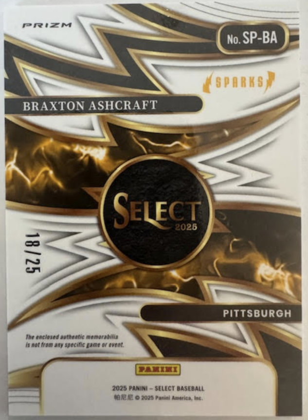The 2025 Select Braxton Ashcraft Sparks Patch RC Tie-Dye Prizm #/25 Pirates 3 Color trading card is a limited edition collectible featuring a player from the Pittsburgh Pirates. This baseball card is part of the Sparks insert set and is authenticated by Panini Authentic. With only 25 copies in existence, this card is a unique piece for fans and collectors alike. Made from card stock and graded by Professional Sports Authenticator (PSA), this rare card is a valuable addition to any sports trading card collection.
