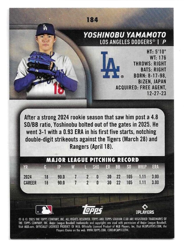 2025 TOPPS STADIUM CLUB LIME GREEN #184 YOSHINOBU YAMAMOTO
