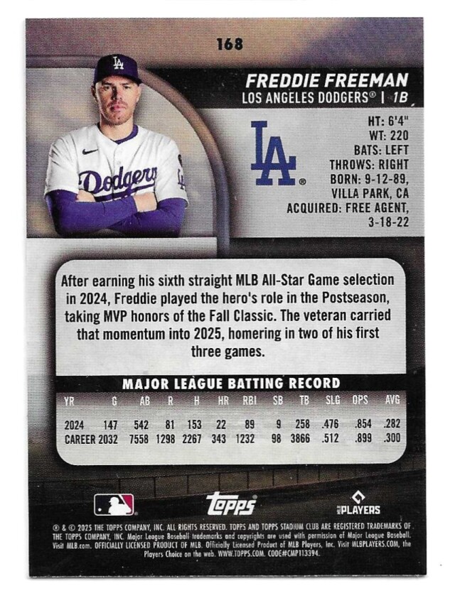 2025 TOPPS STADIUM CLUB SEPIA #168 FREEDIE FREEMAN