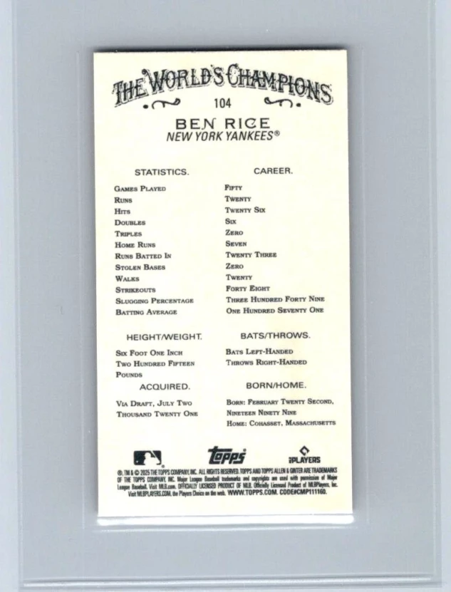 This is a nice example of a 2025 Topps Allen & Ginter #104 Ben Rice Mini Gold Border