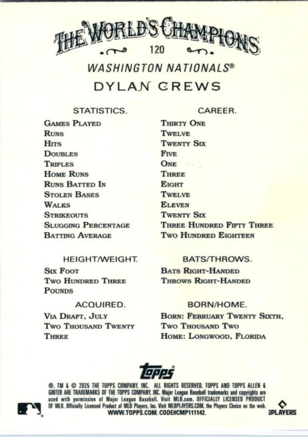This is a nice example of a 2025 Topps Allen & Ginter #120 Dylan Crews Chrome