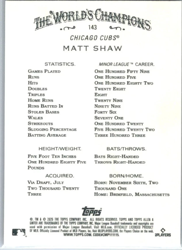 This is a nice example of a 2025 Topps Allen & Ginter #143 Matt Shaw