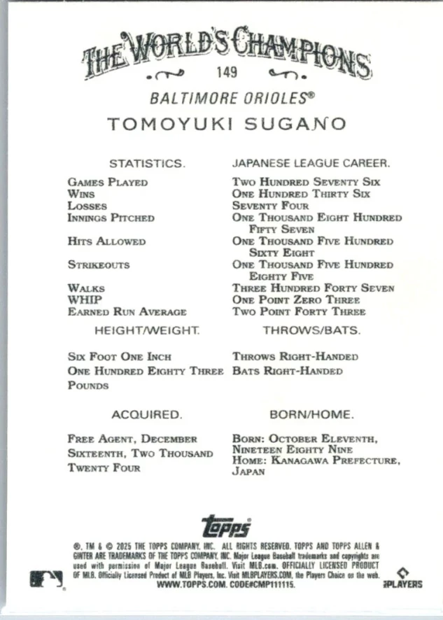 In 2025 Tomoyuki Sugano played for the Baltimore Orioles.