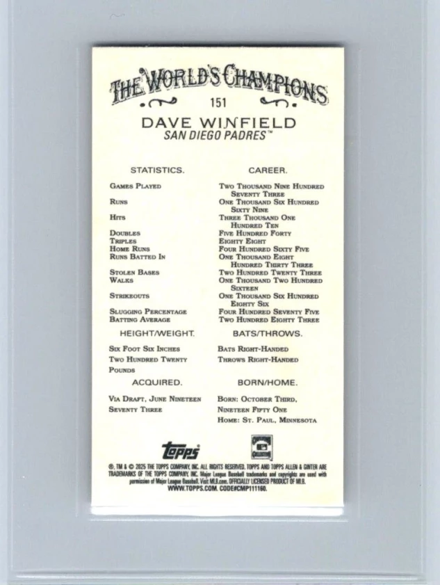 This is a nice example of a 2025 Topps Allen & Ginter #151 Dave Winfield Mini