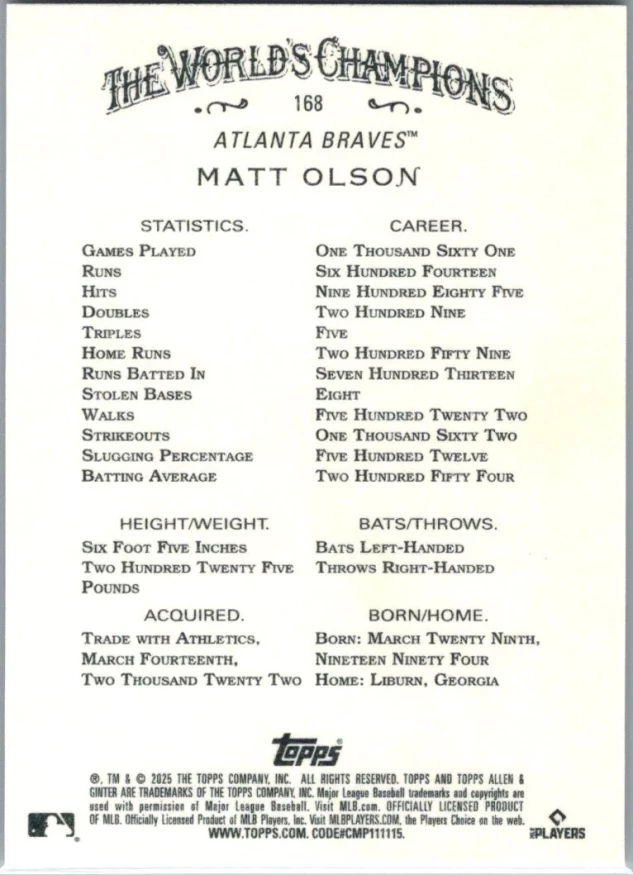 This is a nice example of a 2025 Topps Allen & Ginter #168 Matt Olson