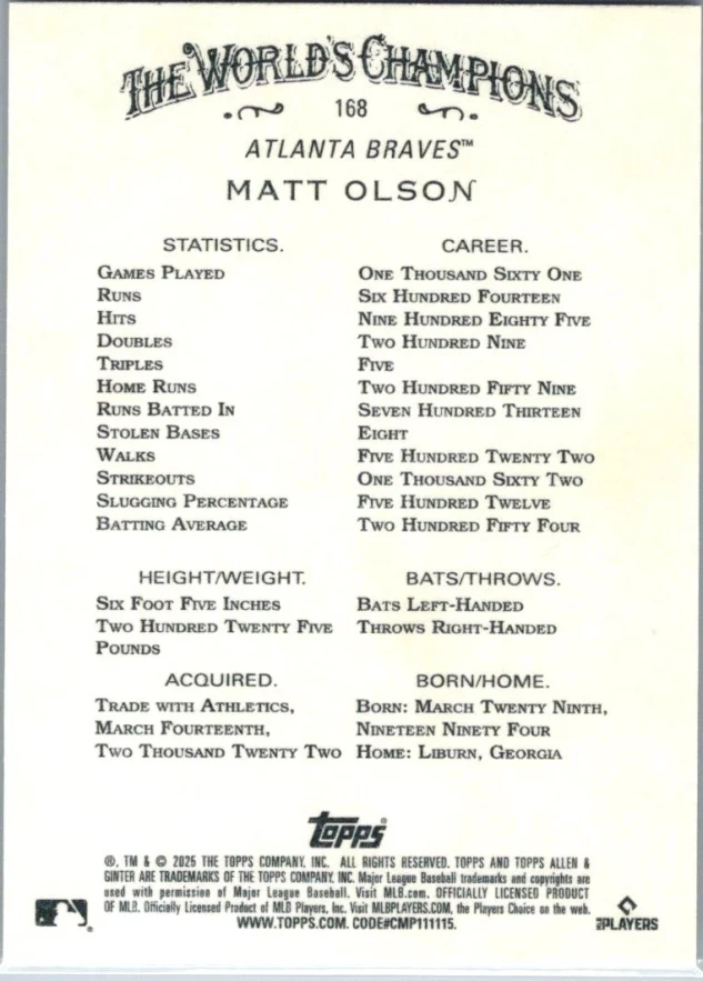 This is a nice example of a 2025 Topps Allen & Ginter #168 Matt Olson